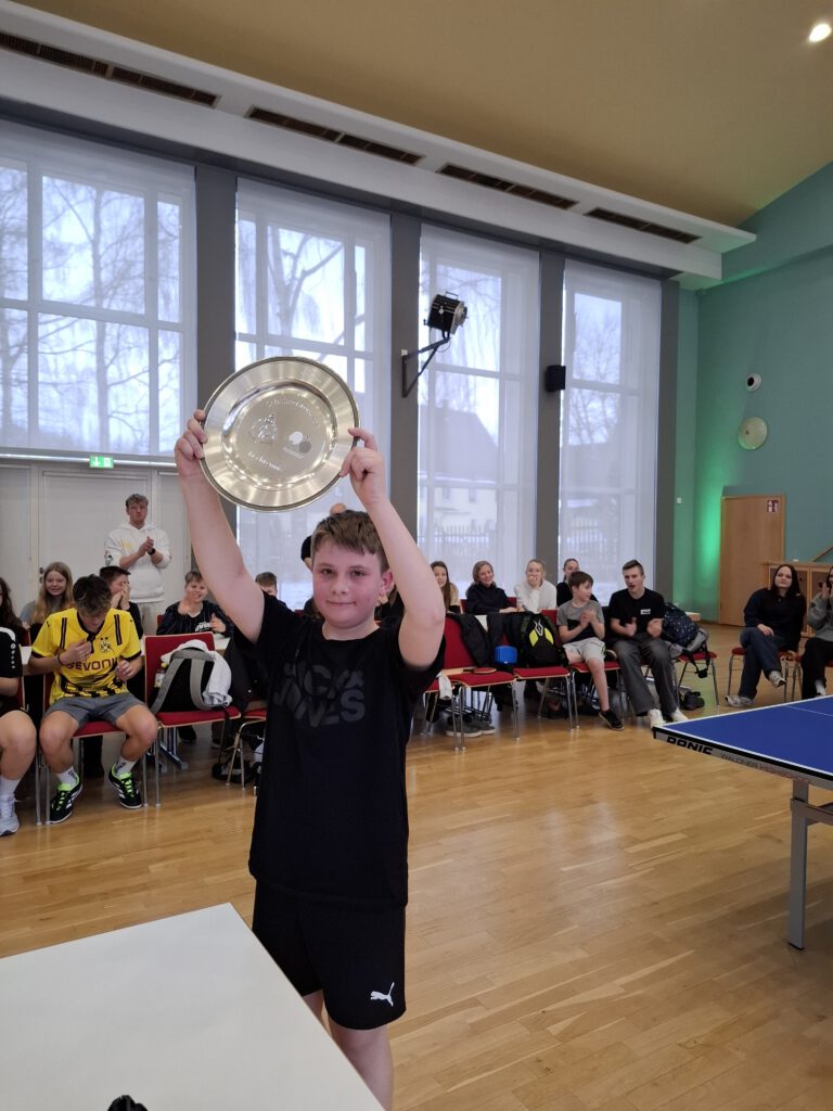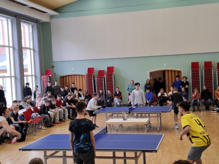 Liam Agsten (6a) ist der Gewinner der diesjährigen Tischtennis-Schulmeisterschaft. In einem denkbar knappen Finale setzte er sich am Dienstag in der Verlängerung mit zwei Punkten gegen Finn-Leon Vettermann (9b) durch. Vorangegangen war dem ein Finalspiel, in dem beide Schüler nervenstark und leidenschaftlich kämpften, begleitet vom Jubel der Schülerschaft und dem Lehrerkollegium. Letzteres hatte mit Frau Fichtner (Ethik/ Französisch) selbst eine Spielerin in die Meisterschaft geschickt, die sich den dritten Platz mit Nick Preussner (9b) teilt – nach einem Zählfehler verzichteten beide in sportlicher Fairness auf einen Entscheidungskampf. Für das bereits zum zweiten Mal organisierte Turnier hatten sich 30 Teilnehmerinnen und Teilnehmer angemeldet. Ab dem Halbfinale fieberten die Klassen der Turnierteilnehmer in der Aula mit und konnten in den Turnierpausen ihren Hunger am Hotdog-Stand der Klasse 10b stillen. Mit dem Überreichen der Meisterschaftsschale, die nun um den Namen des Turniersiegers ergänzt wird, endete ein sportlicher und mitreißender Turniertag an unserer Schule.